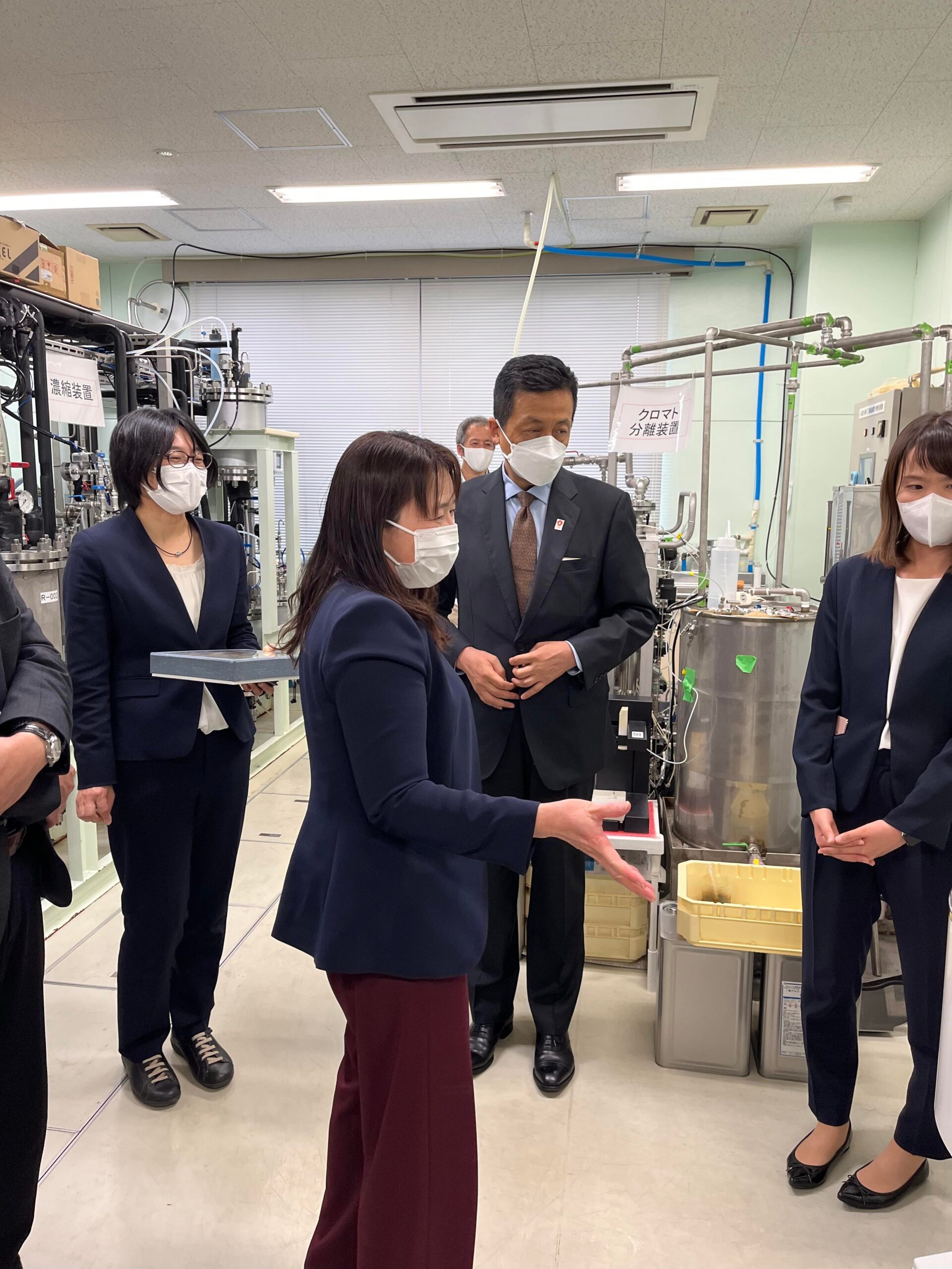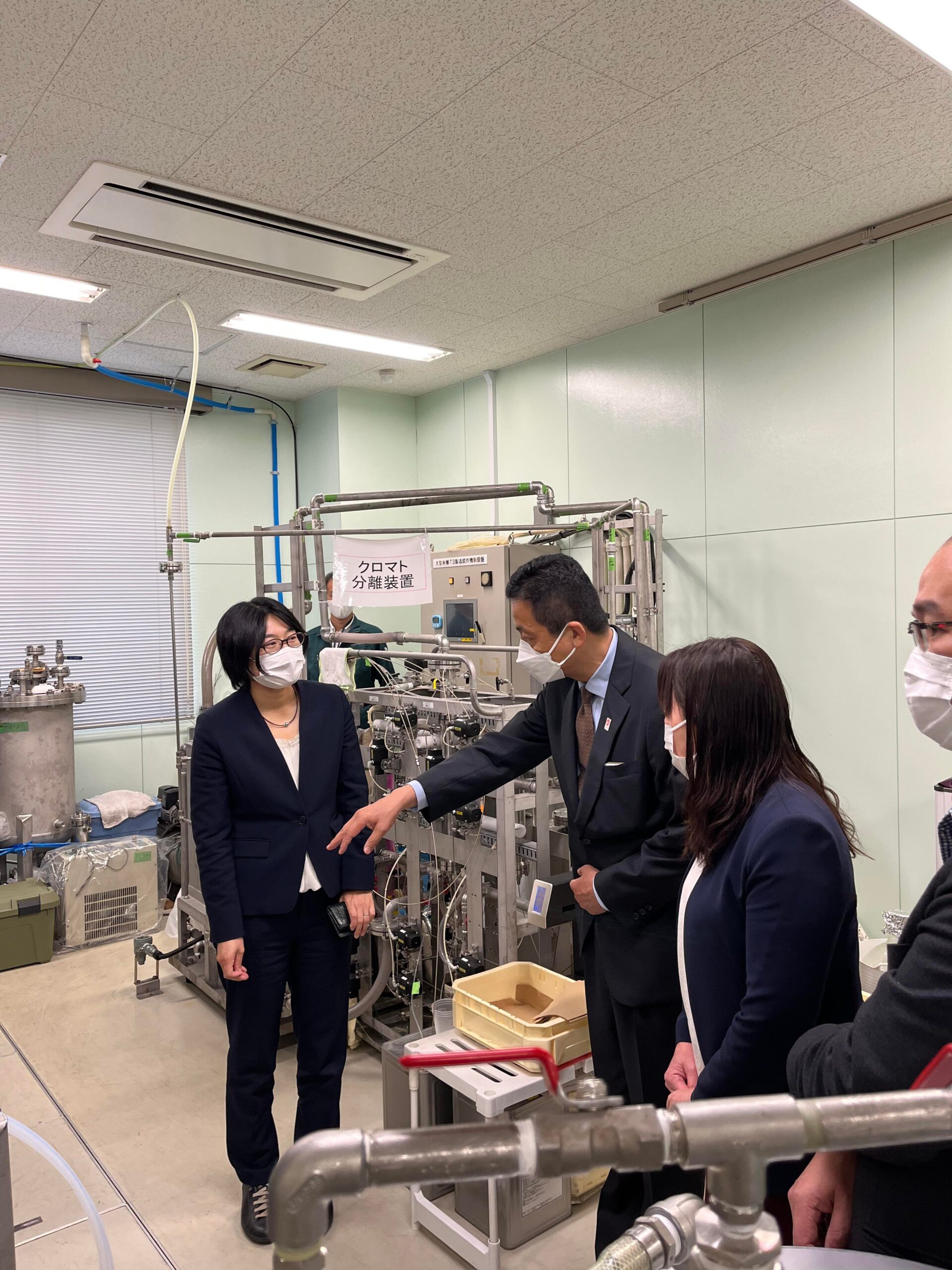 続いて当社製造工場を見学されました。米ぬか未利用油からスーパービタミンEやパラフィンなどの機能性成分を取り出す
